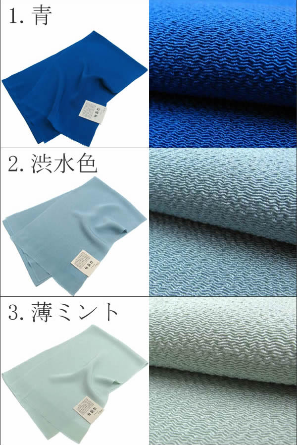 色 1.青…鮮やかなブルー 2.渋水色…くすんだ水色 3.薄ミント…爽やかな淡い緑 4.渋黄緑…くすんだ淡い黄緑 5.カーキ…渋い緑 6.黄緑…鮮やかな黄緑 素 材 絹100% 日本製 着用シーズン 単衣と袷の季節(9月〜6月) 他の帯あげもチェック♪